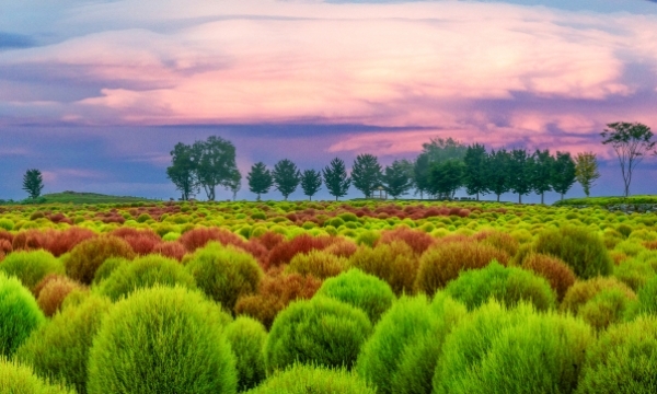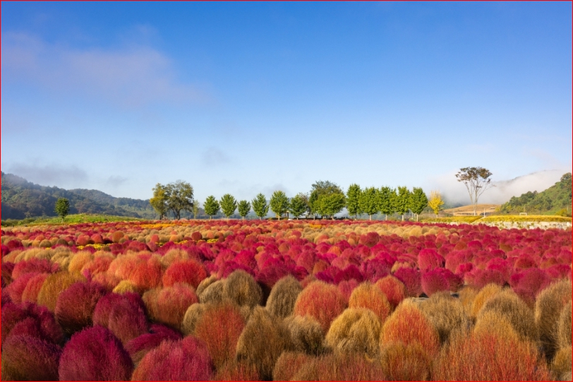 임진강 변의 넓은 들판에 댑싸리(코키아) 수만 그루가 파도처럼 번진 풍경. 여름 중후반엔 산뜻한 연두, 초가을엔 점차 핑크빛을 머금고, 10월 중순 전후로는 선명한 다홍·버건디 톤으로 물들어 ‘붉은 물결’이 됩니다.