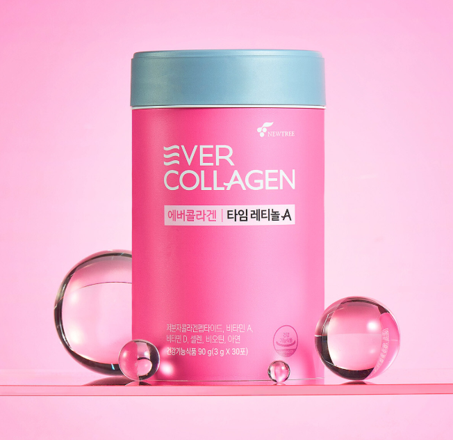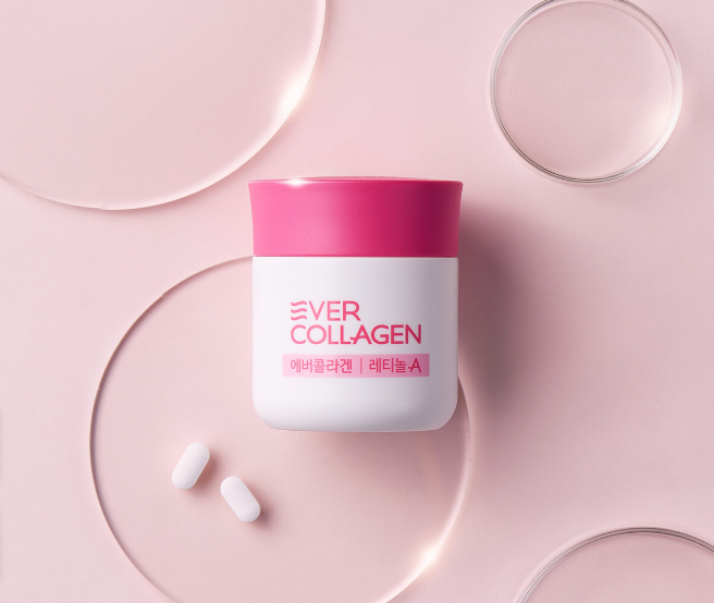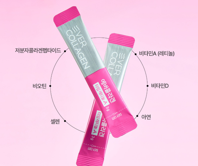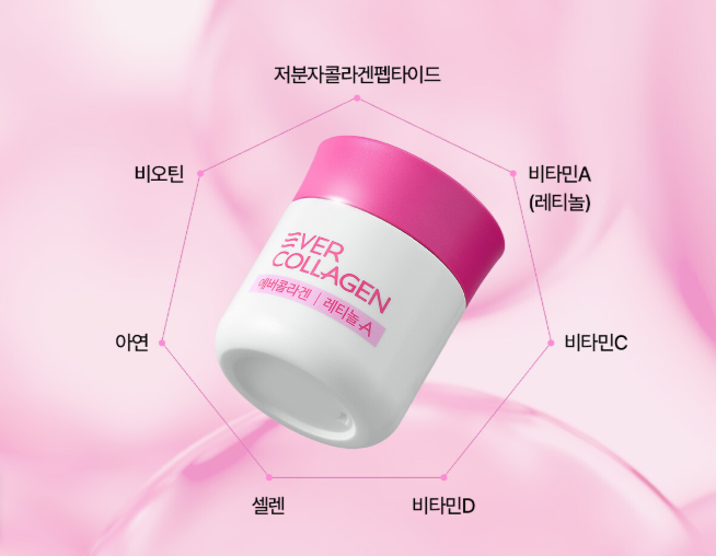 에버콜라겐 레티놀은 먹는 콜라겐(저분자콜라겐펩타이드)을 중심에 두고, 비타민 A(레티놀)**을 하루 권장 기준에 맞추어 배합한 이너뷰티 건강기능식품이었습니다.